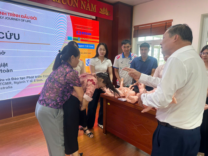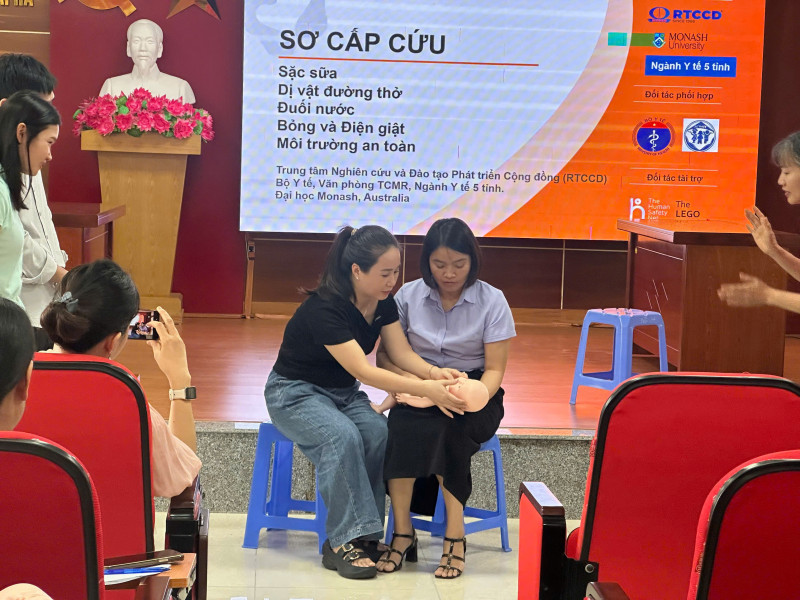 The training aimed to equip commune/ward health workers with comprehensive knowledge and skills on child development, ranging from the caregiving–nurturing framework to recognizing developmental milestones by age. In addition, health workers reviewed first-aid knowledge on common childhood injuries such as choking, drowning, burns, and electric shocks. All participants were required to practice on child dolls.