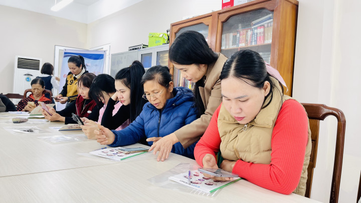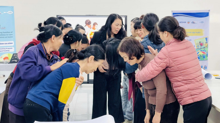 Điểm nhấn quan trọng của khóa tập huấn là dạy thực hành “cầm tay chỉ việc” trên chính các vấn đề thực tế từng trẻ. Giảng viên trực tiếp hướng dẫn, làm mẫu và mời các bà, các mẹ tham gia thực hành trên tình huống cụ thể của con, cháu mình. Phương pháp này giúp phụ huynh dễ tiếp thu, ghi nhớ và áp dụng ngay vào thực tế chăm sóc trẻ tại nhà.